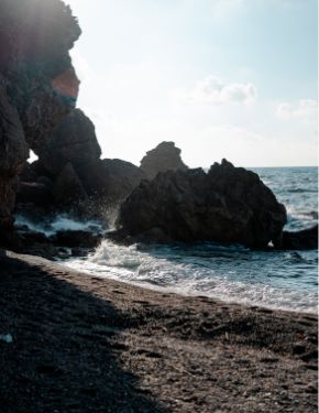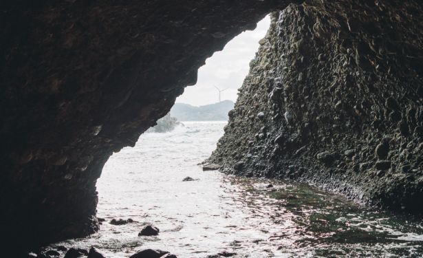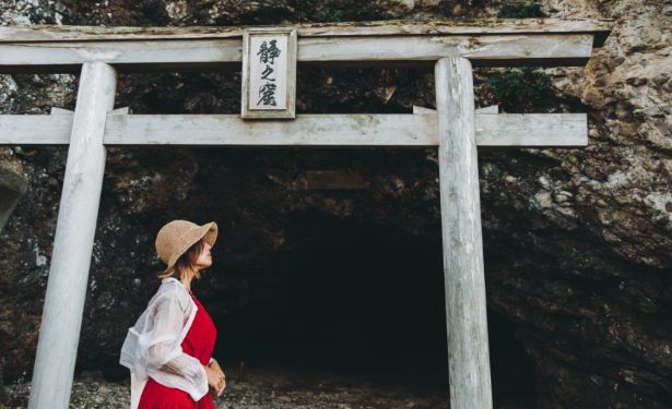 大田市の天然記念物に指定された大きな海食洞で、海岸の岩にぽっかり開いた穴はとても神秘的。日本海に夕陽が沈み空が赤く染まる絶景も望めます。古くは洞窟に静間神社がまつられ、万葉集に詠われる「志都乃石室」の比定地のひとつです。