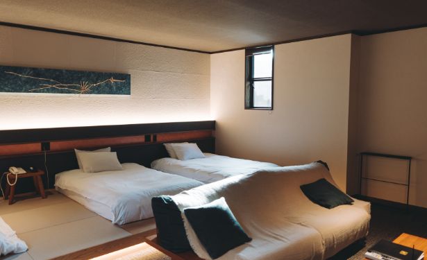 創業250余年の老舗旅館。自然に囲まれた趣の異なる9つの部屋を備え、夕食には地元の新鮮な魚介類や有機野菜をふんだんに盛り込んだ「季節の創作会席」が堪能できます。ラウンジには、日本酒の試飲ができるバーカウンターも。