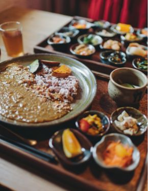 地元で採れる旬の食材をメインに、薬膳でつくる火鍋やカレーなどの薬膳調理、塩麹や酒粕などの発酵調味料を使った料理など、素材の味を生かした体にやさしい料理が味わえます。15種類の小鉢が楽しめる薬膳ランチも人気。